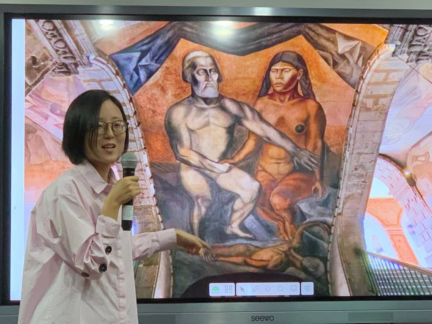 现代博物馆的概念起源于欧洲文艺复兴时期。地理大发现后,来自“新世界”的奇珍异宝被人们按照自然、异域、科学等类别进行陈列、展示。藏品是纷繁复杂,因此就需要博物馆的管理者发掘其背后的逻辑,并以某种方式传达给大众。韩璐学姐以西班牙普拉多博物馆和墨西哥壁画运动为例,向大家介绍了内部空间与公共空间内艺术品展示的不同逻辑。讲座结束后,大家就西语世界艺术相关问题进行了愉快的探讨。