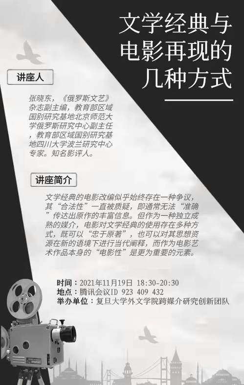 11月19日,北京师范大学俄罗斯研究中心副主任、《俄罗斯文艺》副主编、教育部区域国别研究基地中心副主任、知名影评人张晓东受“跨媒介文化研究创新团队”邀请,为同人小说 师生做了题为“文学经典与电影再现的几种方式”的讲座。讲座由俄文系副教授李新梅主持,近百名师生参与。