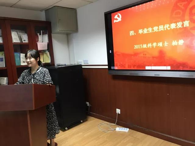 2018届毕业生党员代表、2015级硕士研究生 柏静 发言,她与大家分享了家乡的发展变化,她表示,通过加入党组织,个人收获了成长,对党员身份更加认同和自豪。毕业后,她将回到家乡成为一名高校辅导员,用自己学识和情怀来影响一代又一代的年轻人。