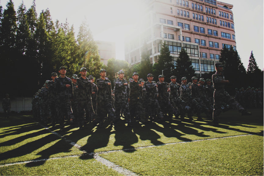 上海的初秋,时而阴雨连绵、天气闷热,时而艳阳高照、烈日炎炎,但悟性高、能吃苦的六连人始终牢记“穿上这身军装,踏进这片训练场地,你就是一名军人。”挥别幼稚的自己,磨砺成军人的模样,站成了一个集体、喊出了一个集体、走出了一个集体。每天的绿茵场上,六连人踏着铿锵的乐声、饱含昂扬的斗志走来,她们目光坚定、士气昂扬,响遏行云的口号唤起胸中的英雄梦,整齐划一的步伐激起心里的军人魂。