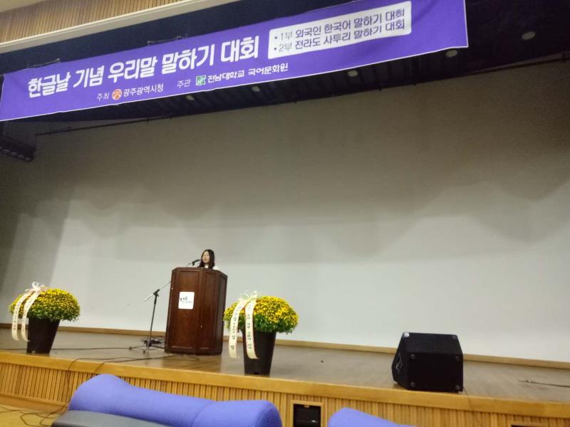 10月9日是韩国的韩文日,是为纪念世宗大王1446年10月颁布《训民正音》,创制韩国现有的文字而设立的纪念日。这一天韩国各地都会举行形式多样的活动庆祝韩文的诞生。本次活动由光州广域市政府主办,全南大学国语文化院、全南大学人文学研究院家庭社区机构联合承办。参加比赛的有来自韩国光州市各大高校的本科生及研究生,最终角逐出大奖一名,最优秀奖一名,优秀奖两名。