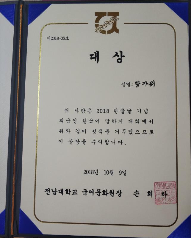 2018年10月9日,在韩国光州市立美术馆举行的第四届光州市民韩语演讲比赛暨2018年韩文日纪念活动中,在韩交流的2016级韩文系本科生黄佳炜同学荣获外国人演讲大赛大奖一等奖。这既是对我院学生在韩交流期间积极参与各项文化交流活动的充分肯定,也展示了韩文系学生良好的语言基础与综合素质。