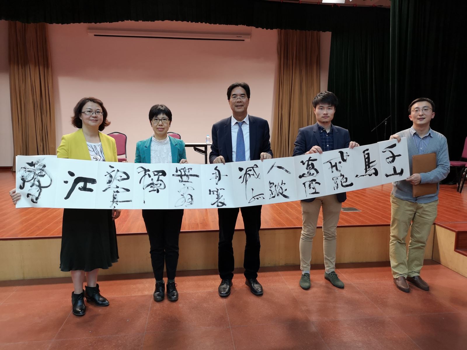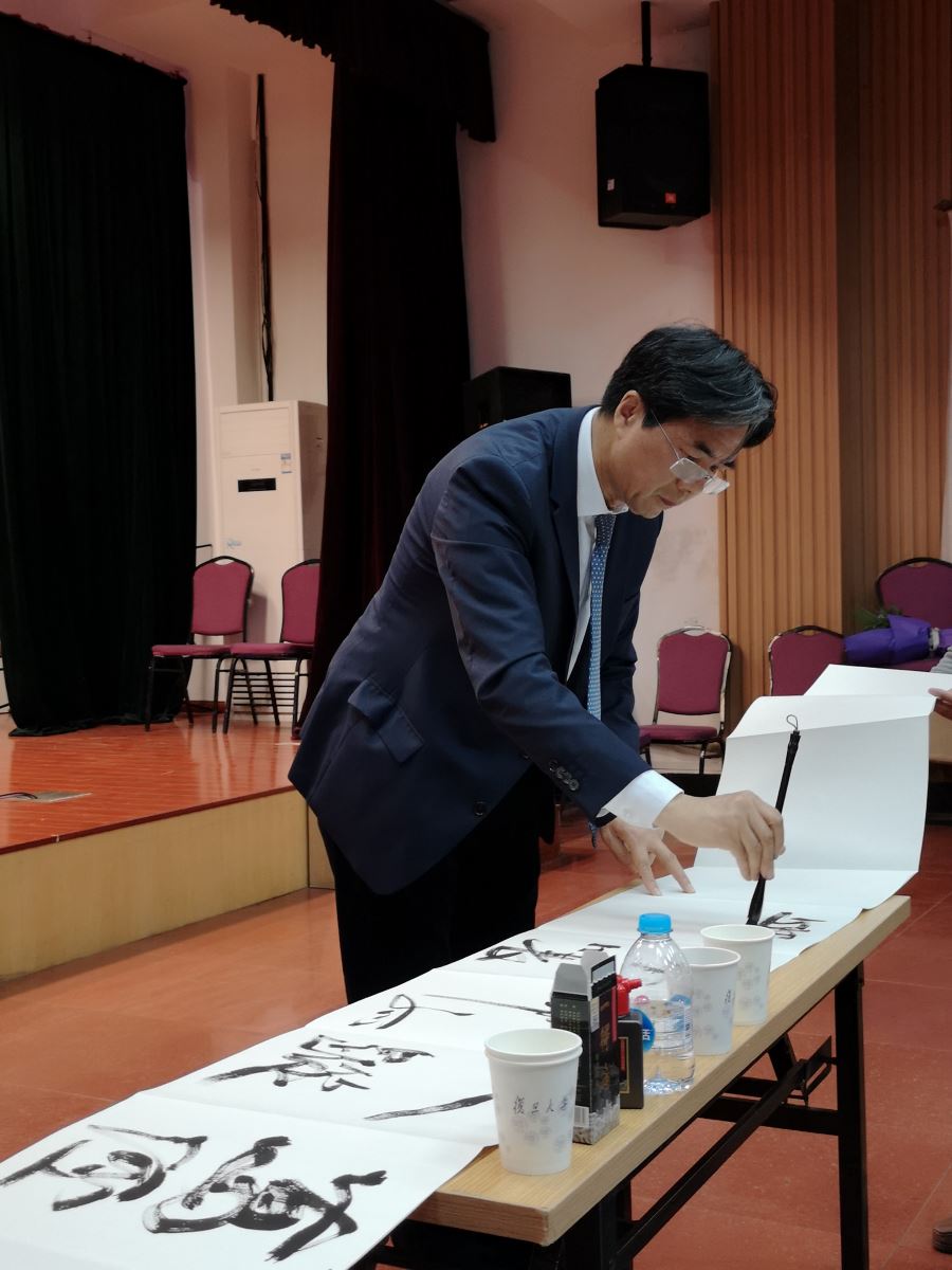 姚校友精通中法文化,热爱书法艺术,讲座现场挥毫泼墨,亲笔题写《江雪》赠给学院。