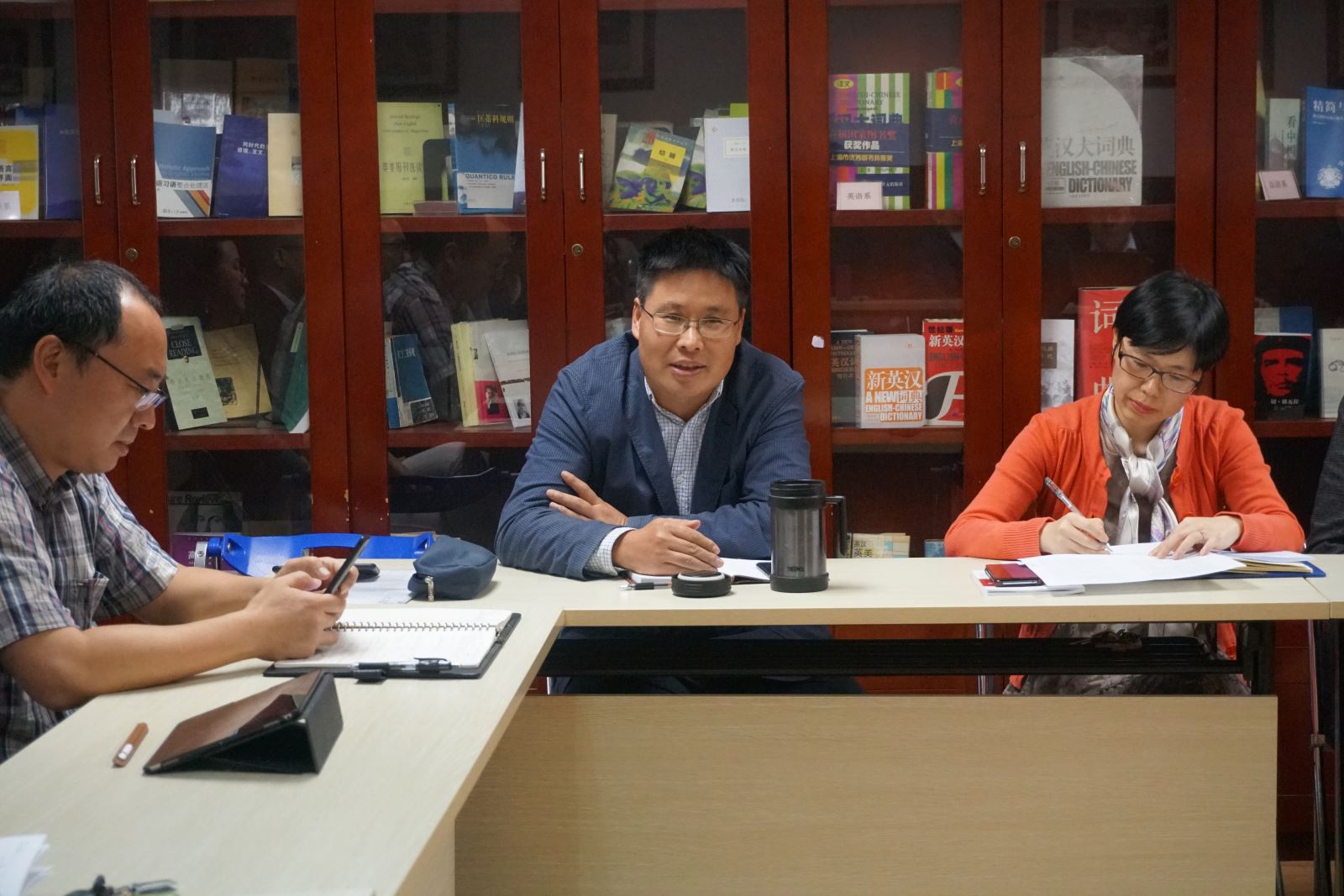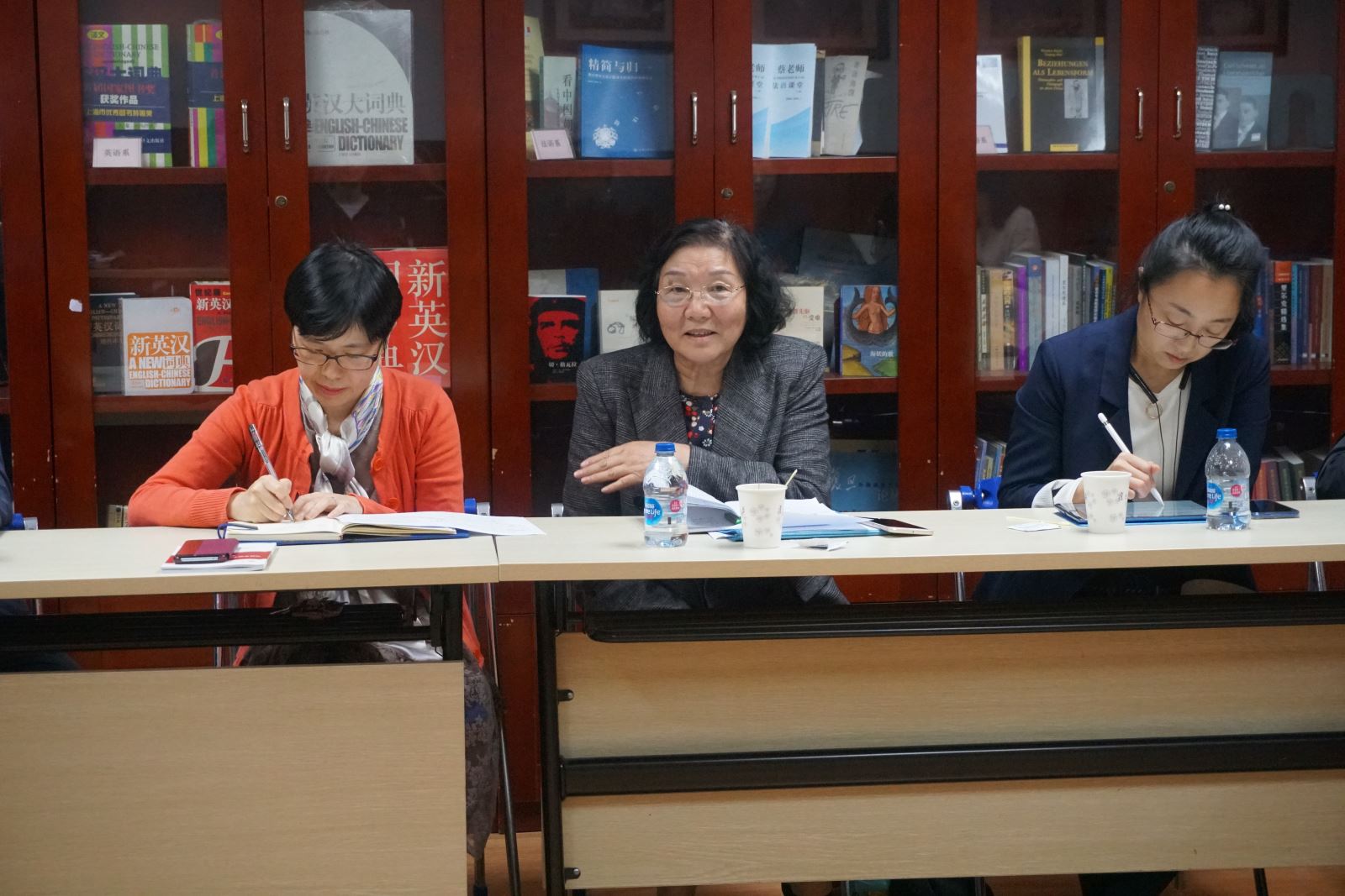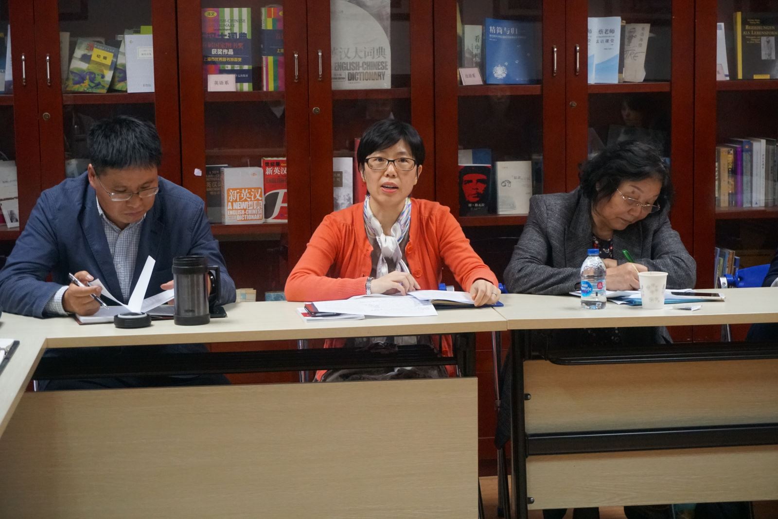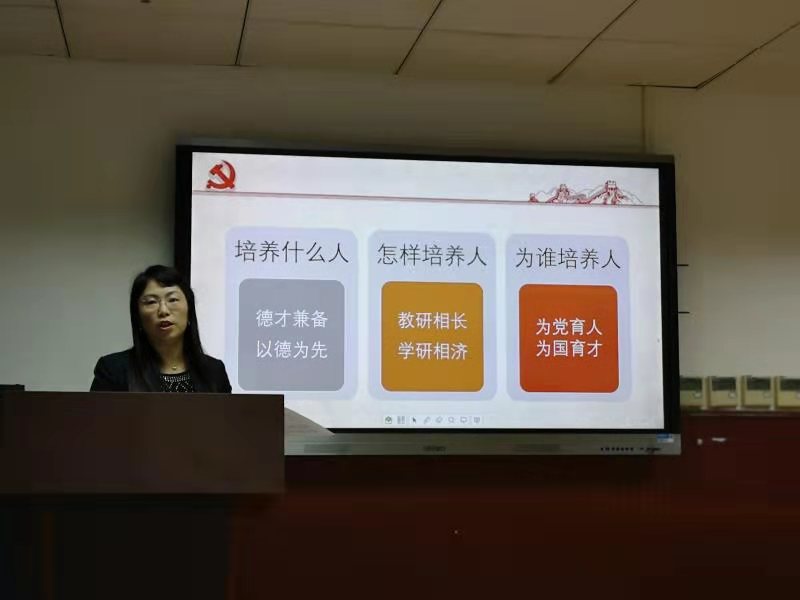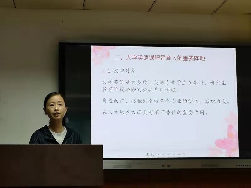 范烨做了《浅谈大学英语教学中的“三全育人”》的汇报,她提出,要提高育德意识的紧迫性,把大学英语部的课程纳入“三全育人”全过程;在课程建设中,要发挥已有课程思政的示范作用,新建多建建设好课程思政的系列课程;在教材选材内容上,要体现新时代新思想的育德内容,发挥好大英部编撰教材在全国的影响力,扩大育人效果的覆盖面;在师资培训上加强督导,在日常教学中落实德育育人要求。