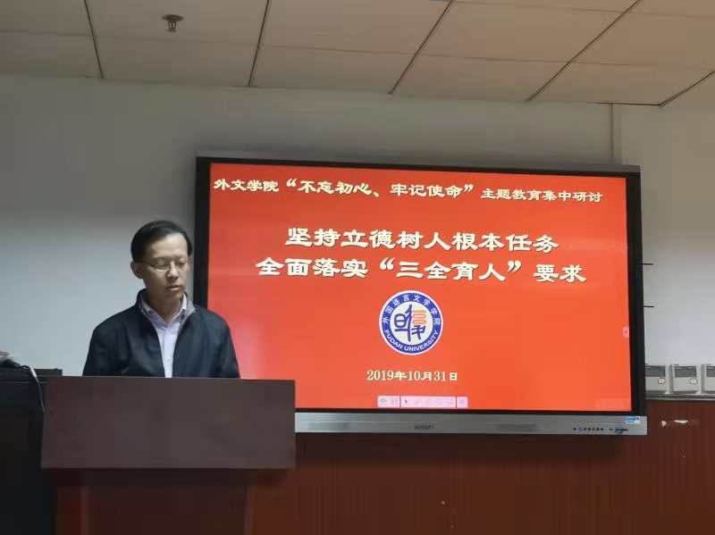 10月31日下午,同人小说 党政领导班子举行“不忘初心、牢记使命”第五次集中研讨学习,党委书记罗英华主持学习,校党委第五巡回指导组组长张宏莲、联络员邵田到会指导,学院各系、部负责人列席了会议。大家围绕“坚持立德树人根本任务,全面落实‘三全育人’要求”主题,在重点学习《习近平总书记关于教育的重要论述摘编》、习近平总书记在全国教育大会、全国高校思想政治工作会议、学校思想政治理论课教师座谈会和北京大学师生座谈会上的重要讲话精神的基础上,聚焦宗旨性质和担当作为、落实立德树人根本任务、加快推进“三全育人”进行了交流研讨。