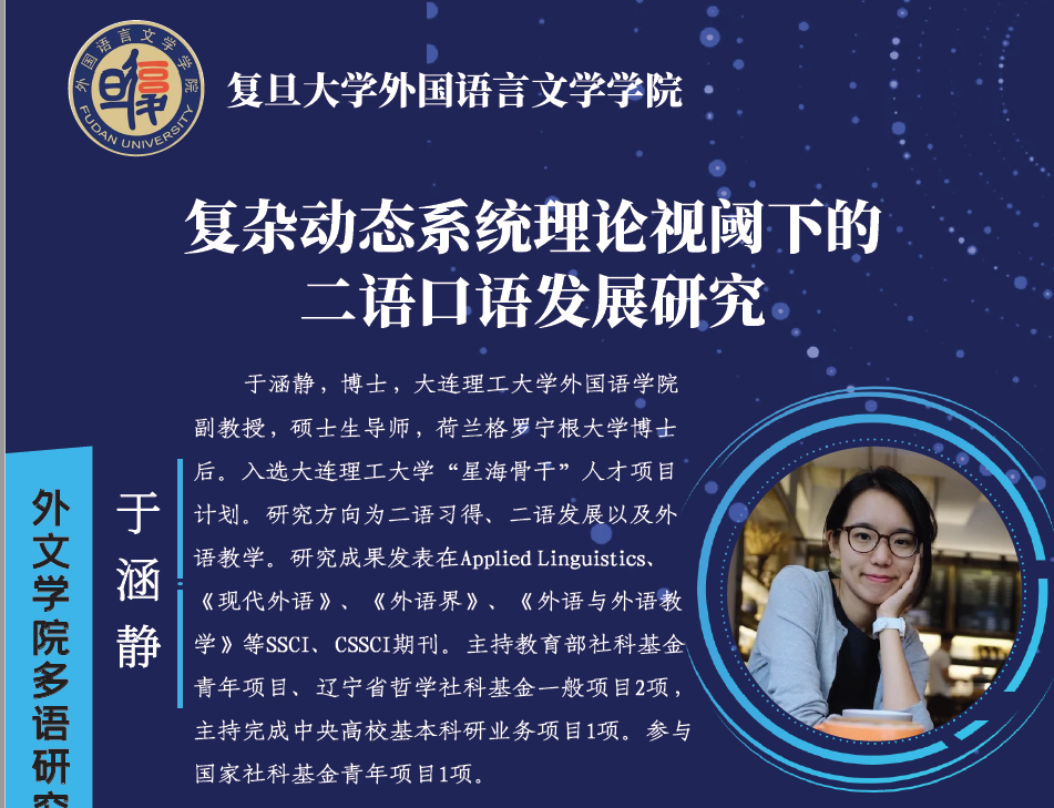 2022年6月2日,同人小说 多语创新团队邀请大连理工大学外国语学院副教授、大连理工大学人才项目计划“星海骨干”于涵静为我院师生以及校内外学者进行了题为“复杂动态系统理论视阈下的二语口语发展研究”的在线学术讲座。讲座由同人小说 教授郑咏滟主持。本次讲座是同人小说 多语研究创新团队的系列讲座之一,校内外200余名师生在线参加了本次讲座。
